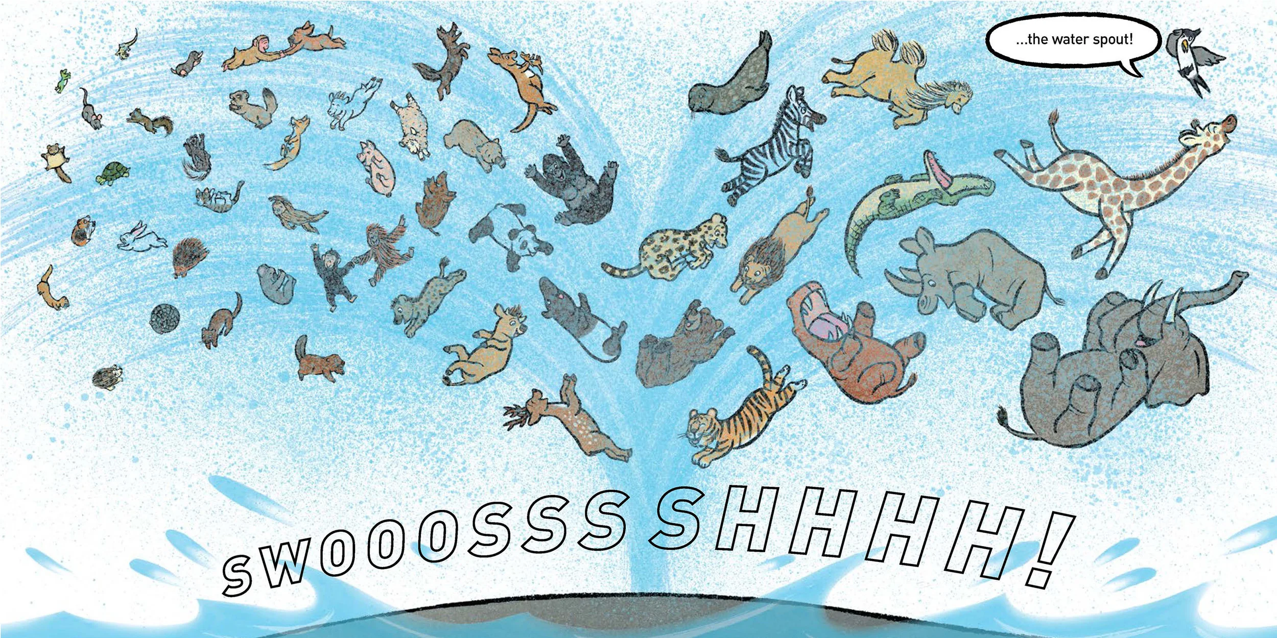 So the animals file, in a very orderly fashion, … on to the back of a Whale! And take off on a raucous ride.
