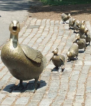 /Make Way for Ducklings is the story of Mr. & Mrs. Mallard and their quest to find a place to nest and then to raise their family of ducklings.