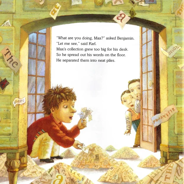 One of the really great things about Max’s Words is that even though Max is clearly the hero, the work of his brothers isn’t undervalued. Max still wants a coin and a stamp. Max and his brothers still value that which is rare. But now they see the value in collecting common things, such as words, as well.