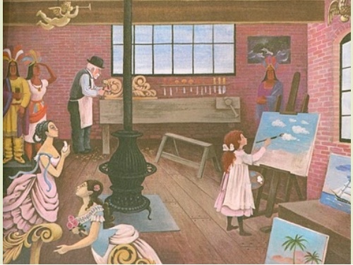 There are delightful family connections between Miss Rumphius, her grandfather and her great-niece. There are hints about how having valuable work can revive us and give us strength and the will to go on.