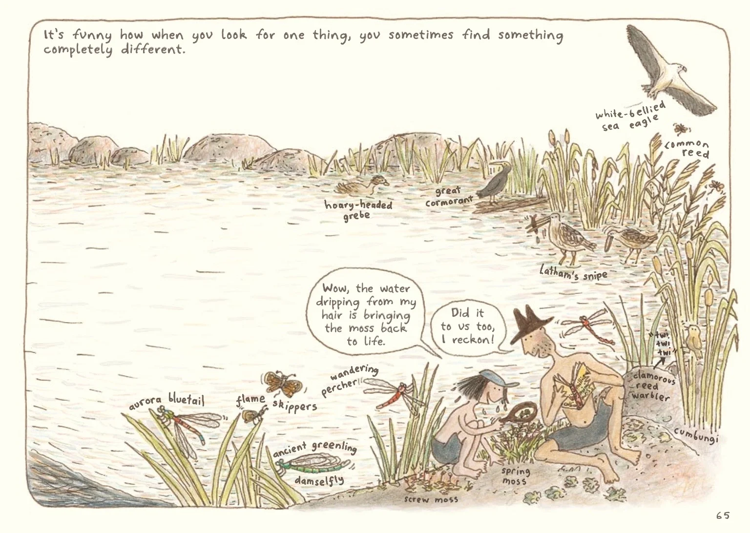 When Clancy finds himself separated from Uncle Egg, waiting on a cliff and feeling alone and ‘in the middle of nowhere’, he watches and notices a lizard hurrying under a rock and ants building ‘earthy homes’. His sense of himself and his connection to the earth grows, and he quietly contemplates the moment and his place in the world: