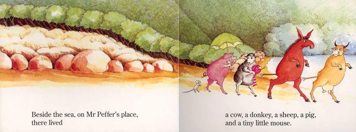 In this story, there’s ‘a cow, a donkey, a sheep, a pig and a tiny little mouse’ who decide to go for a row on the bay.